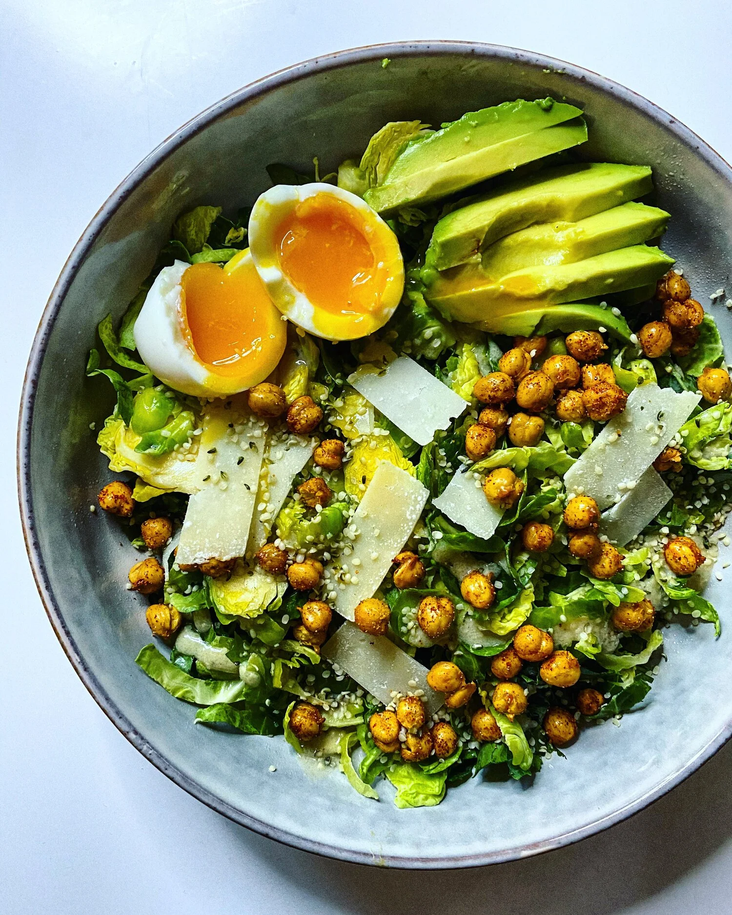4. top massaged kale/brussels with soft boiled egg, avocado, chickpea croutons, shaved parmesan, hemp hearts, Caesar dressing and salt + pepper